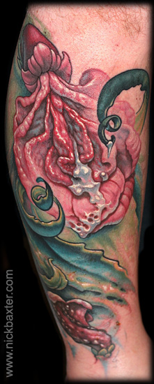 Well what can I say, here's another flower tattoo. I bet you thought i was gonna say "vagina tattoo", huh? Get your mind out of the gutter. No but seriously, this has some nature symbolism attached to it according to Mark, the badass Australian guy who got it (won "best of day" for it too, at Rites Of Passage in Australia). The bottom part is a coverup in progress, and all will eventually be incorporated into a complete lower leg piece.