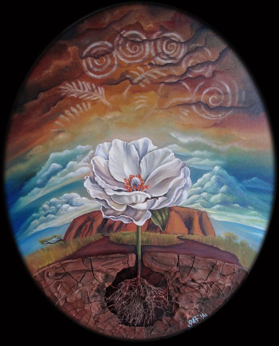 Painting for 100 fires art show in australia, rites of passage fest....oil on canvas, with real roots, and crackle paste